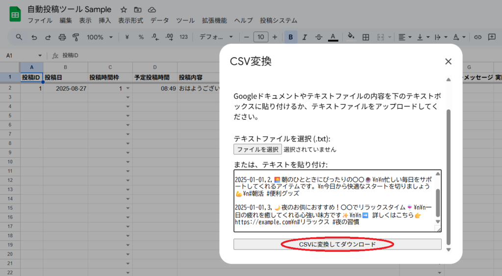 週末にまとめて投稿内容を準備して、CSVファイルで一括読み込み。
